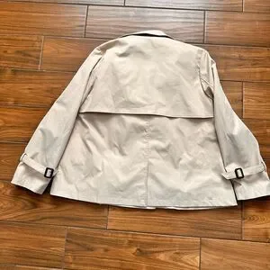 Double-breasted short trench with classic lapel. Cuff straps and front welt pockets for utility. Lightweight lined interior for comfortable wear. Neutral tone pairs with many outfits.