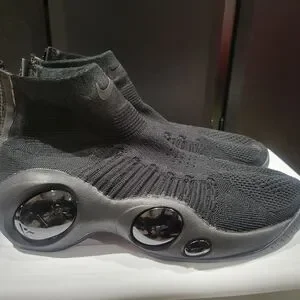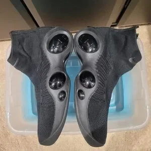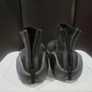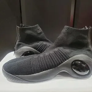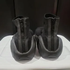Slip-on knit design with a snug, sock-like collar. Elastic upper for a flexible fit. Glossy orb accents on the midsole for a sleek, futuristic look. Minimal, all-black appearance ideal for urban wear.