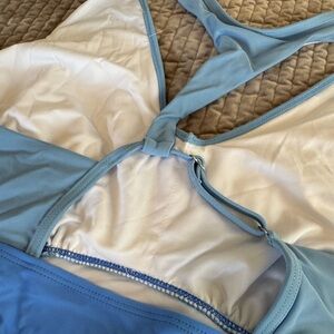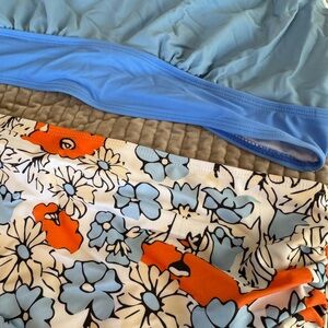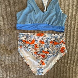 Stylish two-piece swimsuit with a blue top and floral bottoms. Perfect for a day at the beach.