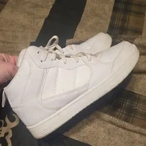 Classic all-white womens and1 high-top sneakers. Lightweight, cushioned insole for everyday comfort. Secure lace-up design keeps feet supported. Smooth synthetic upper is easy to clean. Versatile white color pairs with any outfit. Just throw some new shoe strings in them, look like new.