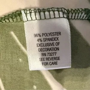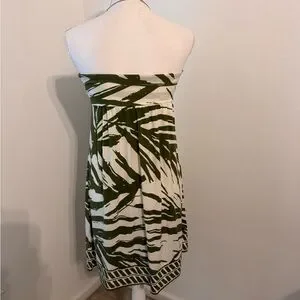Strapless summer dress with a knotted front detail. Olive green and white abstract print. Flowy, lightweight silhouette. Easy pull-on style for casual wear.