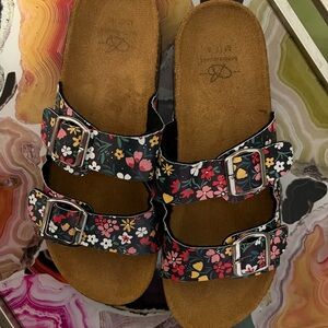 Comfortable women’s sandals with three adjustable buckles. Soft contoured footbed for all-day support. Black upper with multicolor floral print adds a playful, feminine touch. Easy to style with casual outfits.