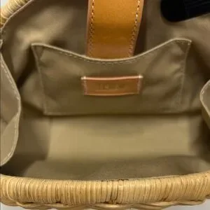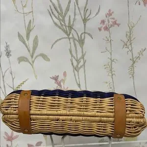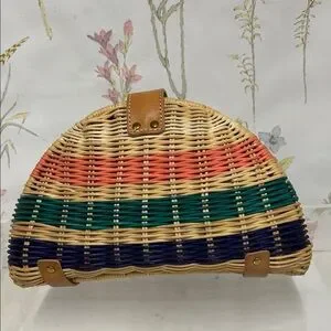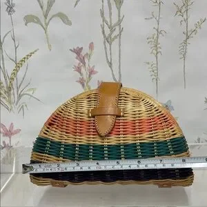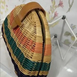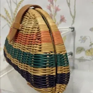Woven straw half-moon clutch by J. Crew. Multicolor woven stripes with coral, teal, and navy bands. Tan faux-leather strap and tab closure. Lightweight and easy to carry. Perfect for casual summer looks.
