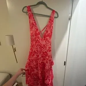 A vibrant red floral dress with a deep V-neck and feminine tiered skirt. Lightweight and flowy for comfortable all-day wear. Stretch straps with a subtle cross-back detail for added style. Perfect for daytime events and warm-weather outings.