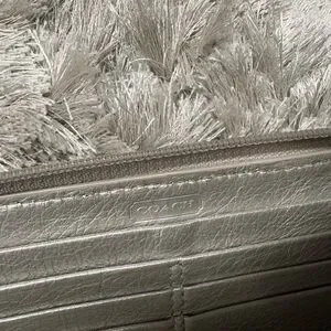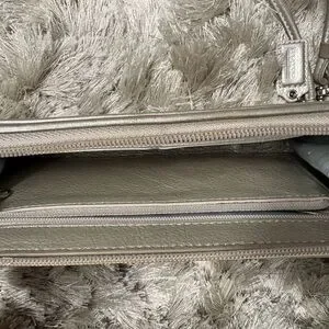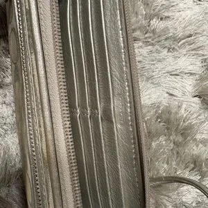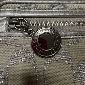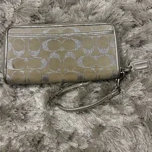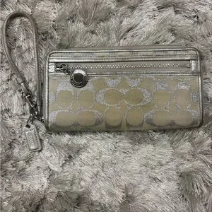 Elegant wristlet with metallic finish. Features zip closure and logo charm.