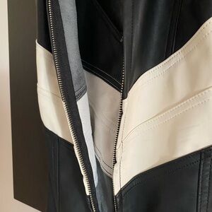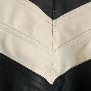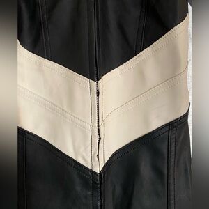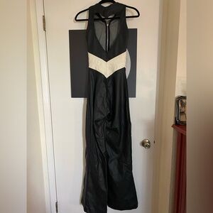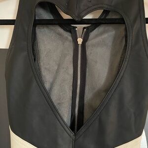 Figure-flattering sleeveless jumpsuit with deep V-neck by Revice LA. Fits like a glove! Heart cutout, contrasting white waist panel highlights the silhouette. Front zipper with ring pull, great used condition, some small blemishes (barely noticeable but shown in photos)