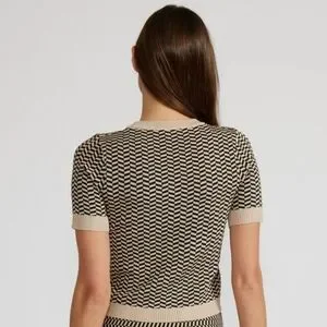 Elevate your style with this chic geometric patterned top. Featuring a classic black and tan design, this top is perfect for any occasion. Pair it with your favorite jeans or skirt for a sophisticated look.