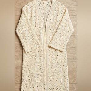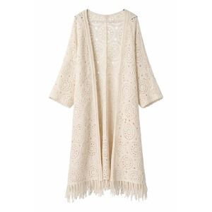 POL Ivory heavy Knit Crochet Fringe Open Long Sleeve Kimono Duster Boho Casual