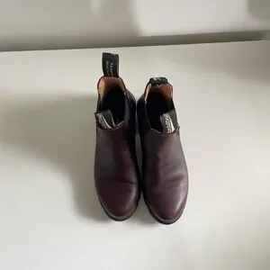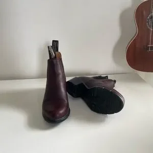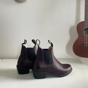 Slip-on Chelsea boots with elastic side panels. Smooth deep wine leather upper. Branded pull tabs for easy wear. Sturdy rubber outsole with low heel. Timeless, versatile silhouette.
