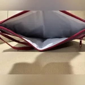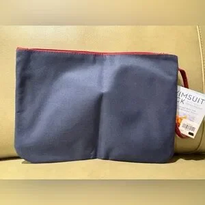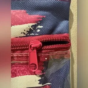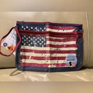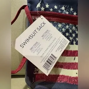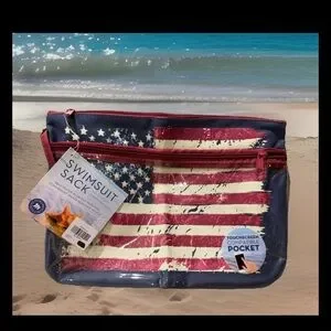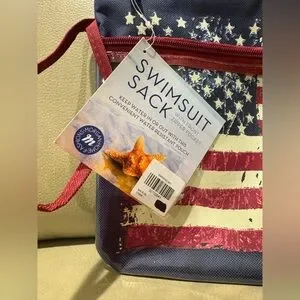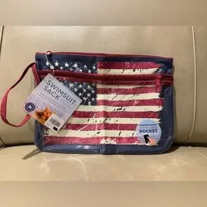 swimsuit sack with American flag design. Features a convenient touchscreen-compatible front pocket and top zippered picket. New with tags. Approximately size 9 inches x 12 inches. Water Resistance. Please see photos.