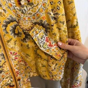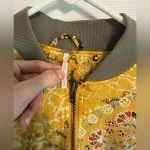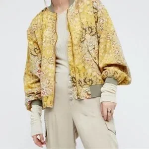 Stylish yellow bomber with paisley design. Features ribbed cuffs and collar. Perfect for casual outings.