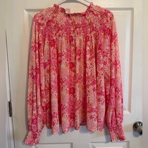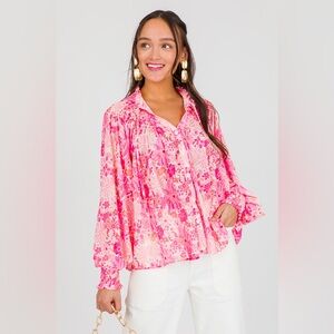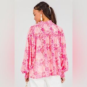 Chic pink blouse with vibrant floral pattern. Features a smocked neckline and long sleeves. Perfect for casual or dressy occasions.