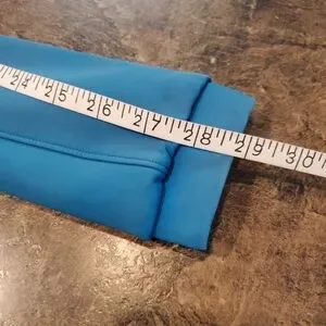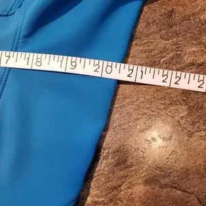 Hi there 😊! The very detailed pictures are very helpful but I still have a few questions. Which picture reflect most the true color? On some pictures, the blue appears bright and on others, faded. What are the measurements at the waist and at the bottom (hips)? Is the material like a soft shell or is it on the stiffer side? Thanks!