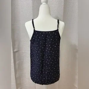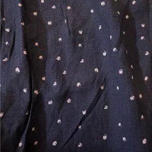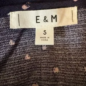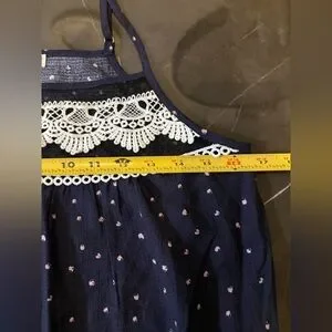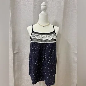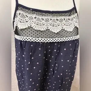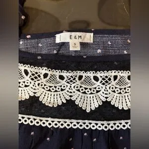 E & M Navy Blue Polka Dot Lace Trim Top Size Small Boho Embroidered Festival
