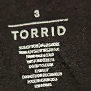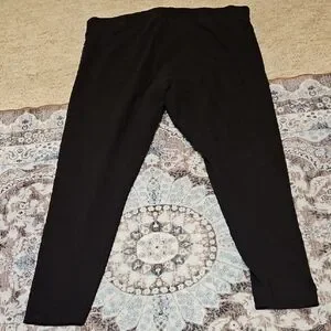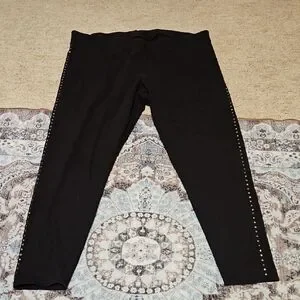 Plus-size black leggings from torrid. Stretchy knit fabric for comfortable wear. Decorative stud trim runs down outer legs. Elastic pull-on waistband for easy fit. Great for casual or dressed-up looks.