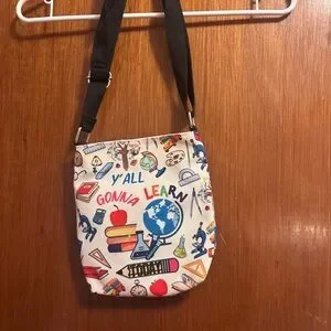 7” by 9” Cute white crossbody bag with colorful educational print. Adjustable black strap