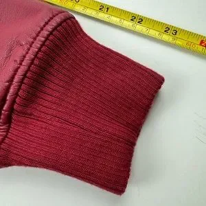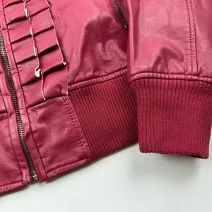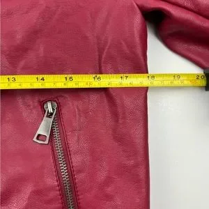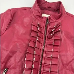 Evy's Tree Red Moto faux leather jacket size small The Zoe ruffle trim flanking
