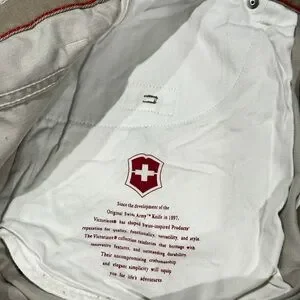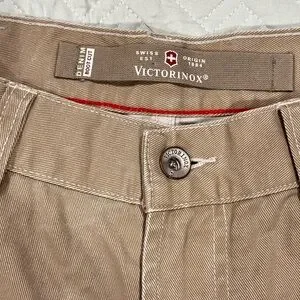 Victorinox Swiss Army denim boot cut pants in tan/khaki color. Durable premium cotton construction with classic 5-pocket design and Victorinox branded hardware. Stylish casual pants with a boot cut leg, perfect for everyday wear or outdoor activities.