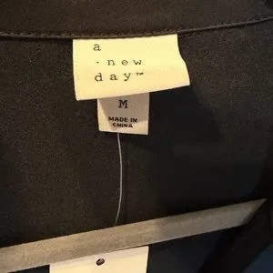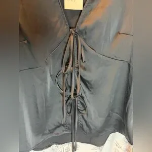 Sleek black blouse with a tie-front detail. Soft satin-like sheen. Pointed collar and long sleeves. Flowy silhouette for easy styling.