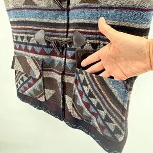 Keywords: aztec vest, southwestern vest, boho vest, geometric print, toggle vest, sleeveless jacket, layering piece, casual wear, fall fashion, winter layering, festival style, travel outfit, outerwear