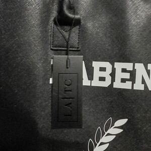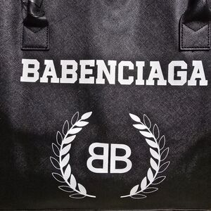 Los Angeles Trading Company tote in black with contrasting white logo, laurel motif, and "BABENCIAGA" print. Sturdy top handles for easy carry. Clean, graphic branding for a modern look. Very roomy; perfect for shopping, travel or work. Slip pocket inside.