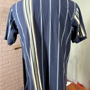Classic vintage 90s striped polo rugby shirt in a navy base with green, blue, and cream vertical stripes. Lightweight cotton blend with a relaxed fit and timeless three-button collar.