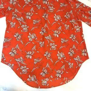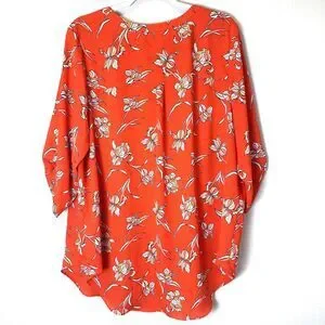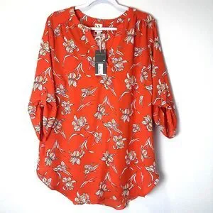 Worthington Women's Size 1X Blouse Floral Orange 3/4 Sleeve Roll- Tab Chiffon