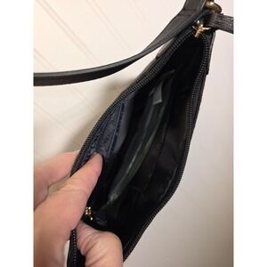 Tommy Hilfiger crossbody bag features a sleek black jacquard monogram pattern with pebbled faux leather trim. Designed with a slim, curved silhouette, it includes an adjustable shoulder strap and gold-tone hardware accents, including a circular logo plaque on the front. The top zipper closure opens to a lined interior with a zippered pocket for secure storage. Perfect for everyday essentials, this versatile accessory combines classic preppy style with modern functionality.