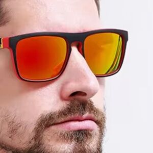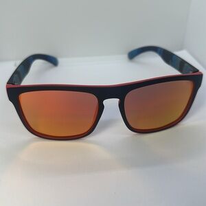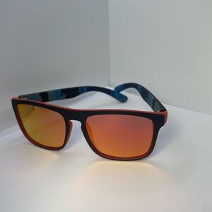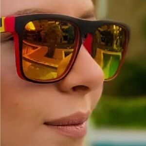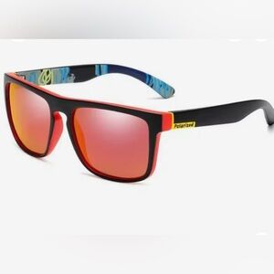 Elevate your style and protect your eyes with these brand new, NWT polarized sunglasses! Designed for both men and women, these shades boast a modern black frame with eye-catching red details and unique multi-color striped arms. The standout feature is the stunning red-orange mirrored polarized lenses, engineered to reduce glare and enhance visual clarity, making them perfect for driving, outdoor sports, or everyday wear.