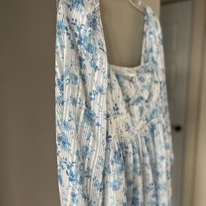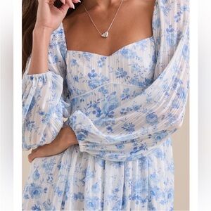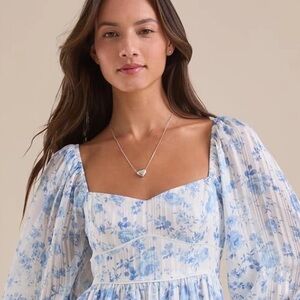 Blue and white whimsical longsleeve sweetheart neckline mini dress. Fully lined with intricate detailing. Perfectly whimsical and romantic.