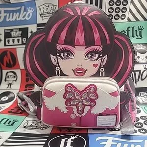 Loungefly character backpack with a bold pink and black design. White front pocket features a jeweled bow accent. Adjustable straps and zip closure. Playful, eye-catching piece for fans and daily use.