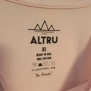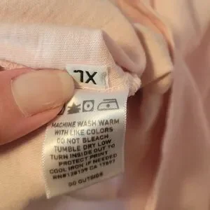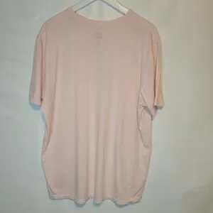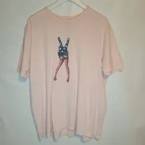 Altru 100% cotton soft light pink short-sleeve tee. Center graphic of leg-shaped peace sign in stars-and-stripes print. Some aging to the graphic. Casual, playful design. GUC