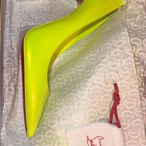 Bright neon yellow patent leather pump by Christian Louboutin. Sleek pointed toe and classic high heel. Signature red lacquered sole for instant recognition. Stylish and bold for evening or event wear.