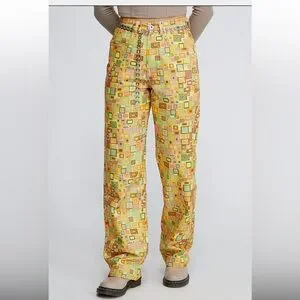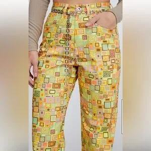 Bold yellow high waisted chinos with geometric patterns.