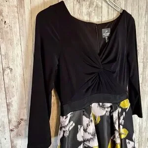 Gorgeous Adrianna Papell formal/cocktail dress with a solid black jersey crossover v-neck bodice, and long jacquard ball-gown floral skirt. Ribbon waistline. Polyester. Back zip, fully lined.