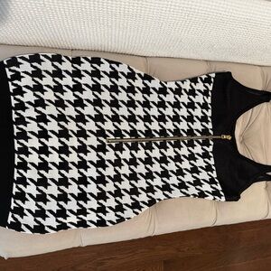 Chic mini dress with bold houndstooth pattern. Features striking gold buttons. Perfect for stylish outings. The straps have been shorted a small amount but can be let back out. Dress says size 40. i am a 4 to 6 in dress size to help. Amazing dress i used it twice .