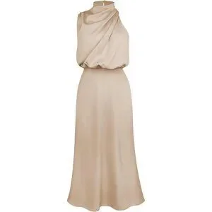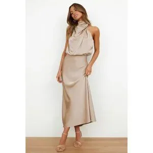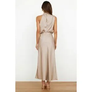Women's Almond Spring Summer Satin Sleeveless Elegant Formal Mock Neck Maxi