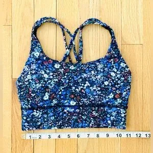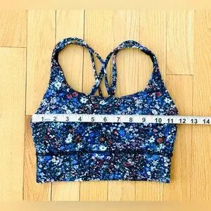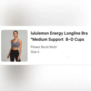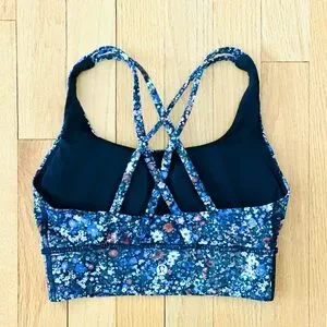 Lululemon Energy Longline Bra Size 4. Medium Support B-D Cups. Flower Burst Multi color. Comes with optional, removable cups. In excellent used condition.