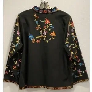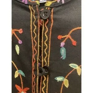 Vibrant embroidered floral jacket on a black cotton-blend base, featuring a mandarin collar, full button front, and contrast trim at the edges. Multicolor threadwork in bright orange, purple, turquoise, and gold creates a playful folk-art aesthetic. A beautiful art-to-wear piece that blends 90s eclectic charm with modern bohemian style.