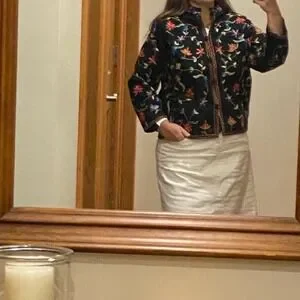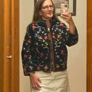 vintage embroidered jacket, floral boho coat, folk art style, colorful 90s fashion, tapestry jacket, mandarin collar, art to wear, eclectic retro outerwear, festival jacket