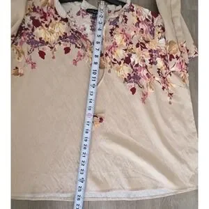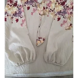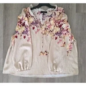 New without tags. Women's plus size blouse by Como Black Woman in size 2X. Features a soft beige/cream base with multicolor floral print, long sleeves with elastic cuffs, and a flattering tie-neck detail with a V-neckline. Lightweight and breathable fabric with a relaxed, comfortable fit, suitable for casual wear, work, or dressier outfits.
