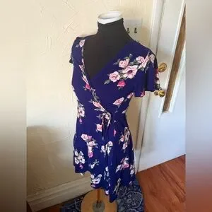 Caution To The Wind Blue V-Neck Flutter Sleeve Mini Wrap Dress -S-
