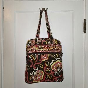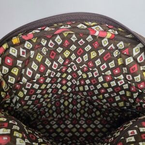 This vintage shoulder bag by Vera Bradley is as gorgeous as it is practical. It features a soft quilted exterior with a Puccini pattern in brilliant pink, orange, yellow and white set against a rich chocolate brown background; the inside lining features a delicate diamond pattern. This bag is perfect for everyday outings, and it’s ideal for travel. On the outside, there are two magnetic snap pockets on the front, and one zippered pocket across the back. Inside, there is one large zippered pocket, and three small open pockets. It can be handheld, or worn over the shoulder. This bag is in excellent pre-loved condition. Measures 13” (33cm) long, 14” high (35.5cm), 3.5” wide at the base (9cm); the strap hangs 10” (25.5cm) The Puccini pattern was released for the Fall 2008 collection, and has been retired since then. As noted on its website, “Best known for our iconic prints and smart styles, Vera Bradley is a leading designer of women's handbags, travel items and accessories. We design thoughtful solutions filled with special details that make each day easier... and a bit more beautiful.”
