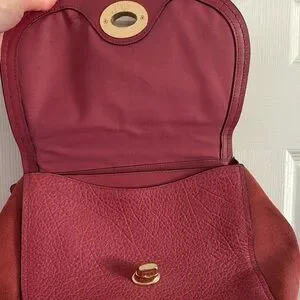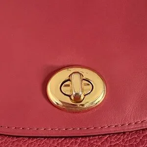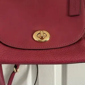 Chic Coach crossbody bag in dusty pink. Features sleek gold hardware. Ideal for versatile styling. Mixed material with both leather and suede. Features an adjustable cross body strap and a shoulder strap. Turn lock closure open the main pocket which has a large slip pocket in front of the main section. Main section has a small slip pocket and a back zipper pocket. Magnets on the side.