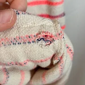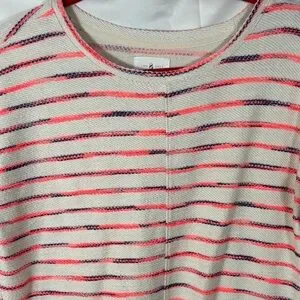 Casual short sleeve dress with red and blue stripes. Features two front pockets. There’s a small hole in the underside of one of the pockets. Please see pictures.