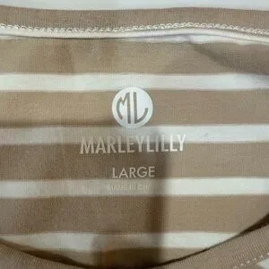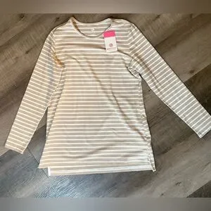 Stylish long sleeve top with beige and white stripes. Perfect for casual wear. See photos for details.