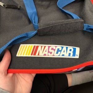 Stylish NASCAR themed duffel bag in black and blue. Perfect for travel or gym use.