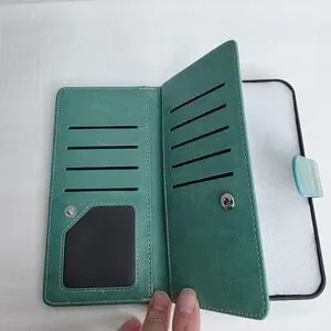 Combines wristlet wallet with a magnetic basic case. The back case has built-in magnets and a metal plate for easy attachment to metal surfaces and perfect compatibility with magnetic car mounts