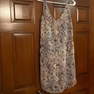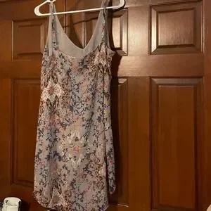 Very good used condition. Fits loose like a slip. Straps are adjustable. Laying flat pit to pit is approximately 19 inches from the center of the chest to the bottom of the dress measures 31 inches. Has a built-in slip. Dress has pockets