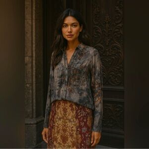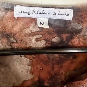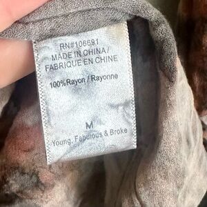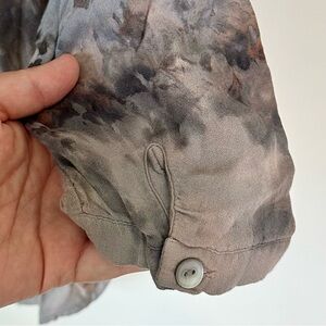 Young Fabulous & Broke long-sleeve shirt in a charcoal brown and gray tie-dye style. Flowy rayon fabric with a half button-down front and two pockets. Cuffed sleeves add a chic touch. Perfect for a boho vibe or a street-chic look.